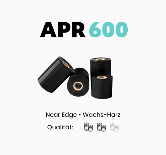 APR®600 ist die weltweite Referenz für Wachs/Harz-Farbbänder für Corner Edge- und Near Edge-Drucker. Seine Leistung (Geschwindigkeit, Empfindlichkeit, Vielseitigkeit, Schwärze) bietet eine perfekt angepasste Antwort für die meisten Anwendungen.