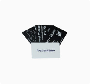 Die Karten sind langlebig und leicht zu reinigen – selbst in der Spülmaschine, und der Aufdruck erfolgt in wenigen schnellen und einfachen Schritten. Eine individuell beschriftete Plastikkarte mit allen erforderlichen und gewünschten Informationen, sei es zur Allergenkennzeichnung oder einfach als attraktive Produkt- und oder Preiskennzeichnung.